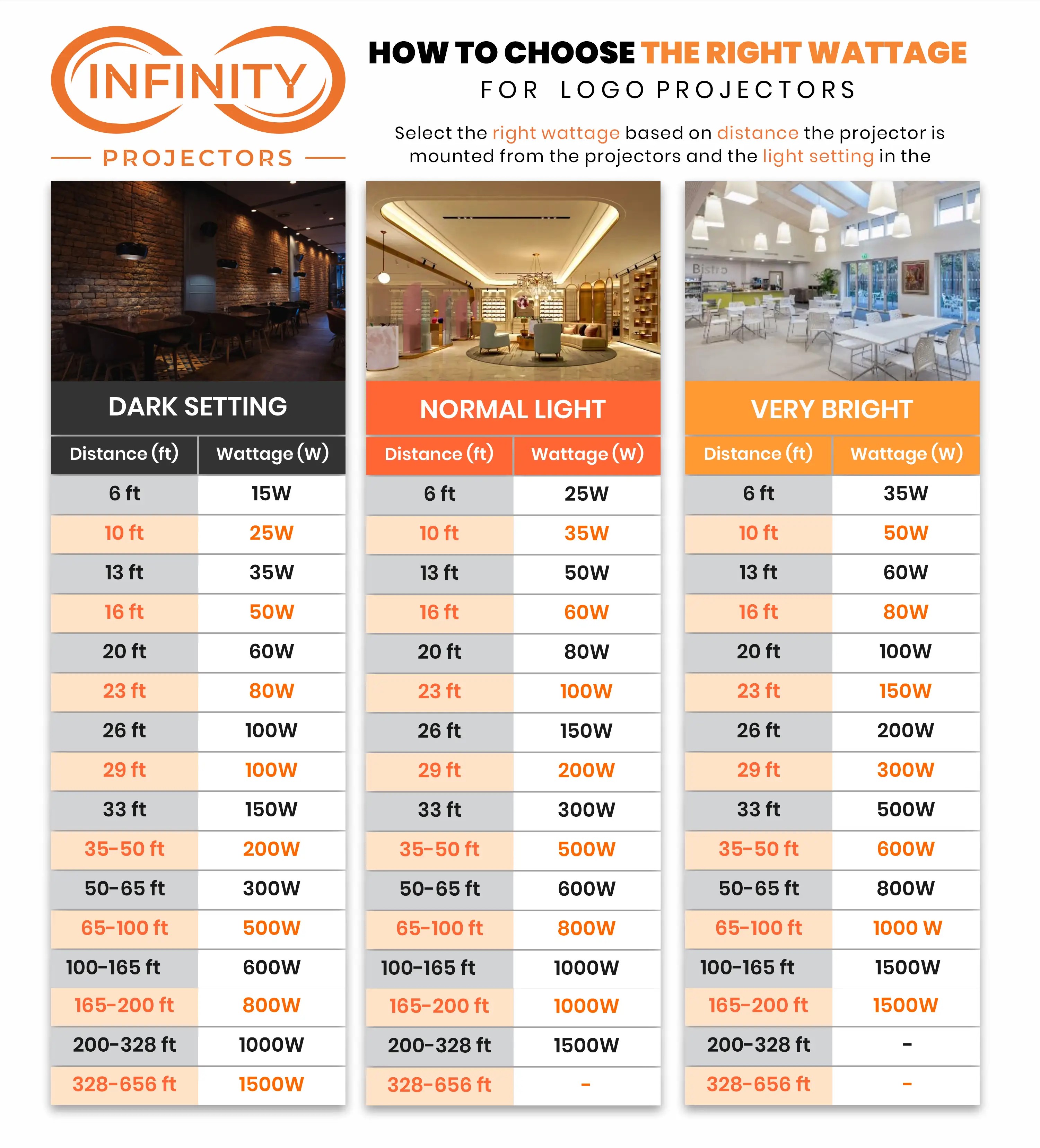 This indoor gobo projector offers your choice 15 watts up to 50 watts of power to illuminate and rotate your logo on any surface using our custom advertising indoor logo projector using state of the art 4k HD imaging. Project your logo onto any wall, floor or ceiling for over 50,000 hours of use in the most unique indoor or outdoor environments.This custom logo projector works like a hologram projector and can be used at home or any business to project your custom logo, photo, messages or any virtual sign. Infinity Projectors offers 2 Free Gobos with every purchase of a Gobo projector. This allows you to change the logo or message that is being projected by our indoor advertising projection lamp and plan out your promotion or decoration for the year. Order today and receive free shipping a